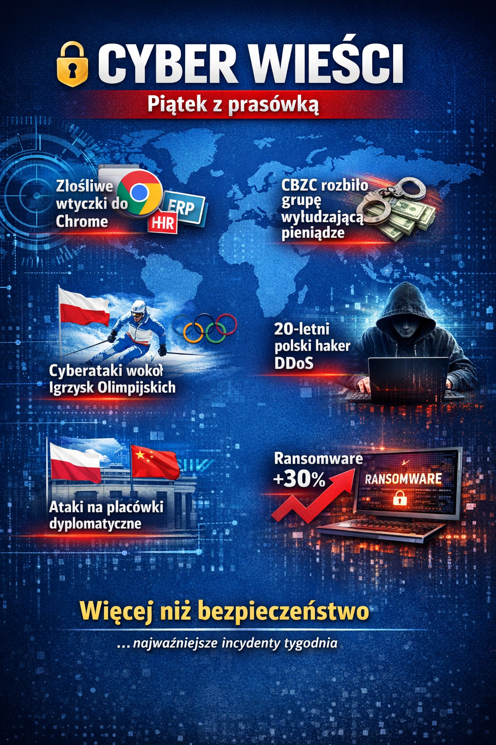 Ten tydzień przyniósł kilka sygnałów ostrzegawczych dla organizacji publicznych i prywatnych — od ataków na środowiska biznesowe przez złośliwe rozszerzenia, przez przejęcia kont bankowych, aż po działania o charakterze szpiegowskim wobec administracji państwowej. Wspólnym mianownikiem większości zdarzeń pozostaje socjotechnika, kompromitacja punktów końcowych oraz brak segmentacji i monitoringu anomalii.